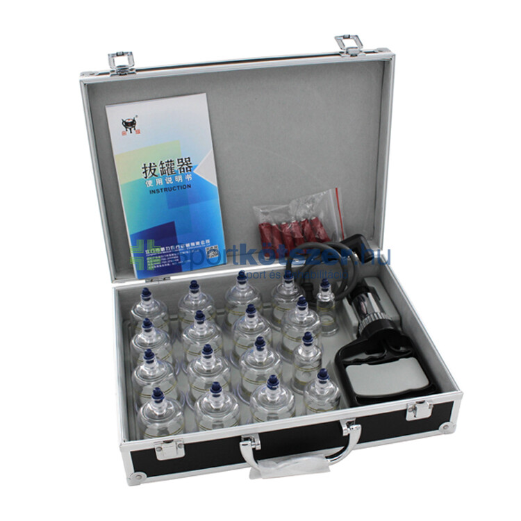 Köpölyszett 17db vákuumpumpával praktikus alumínium kofferban. Tartós köpölykészlet 19 törhetetlen polikarbonát haranggal, kézi pumpával. A köpölyök tetején egy szeleppel ereszthető ki a levegő.